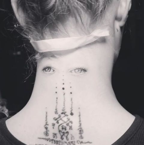 حصلت عارضة الأزياء الأنجليزية  كارا ديليفين على وشم غريب على رقبتها وفلسفي يعبر عن معتقداتها وكان بشكل عينين ورسومات مبهمة اسفلهما.