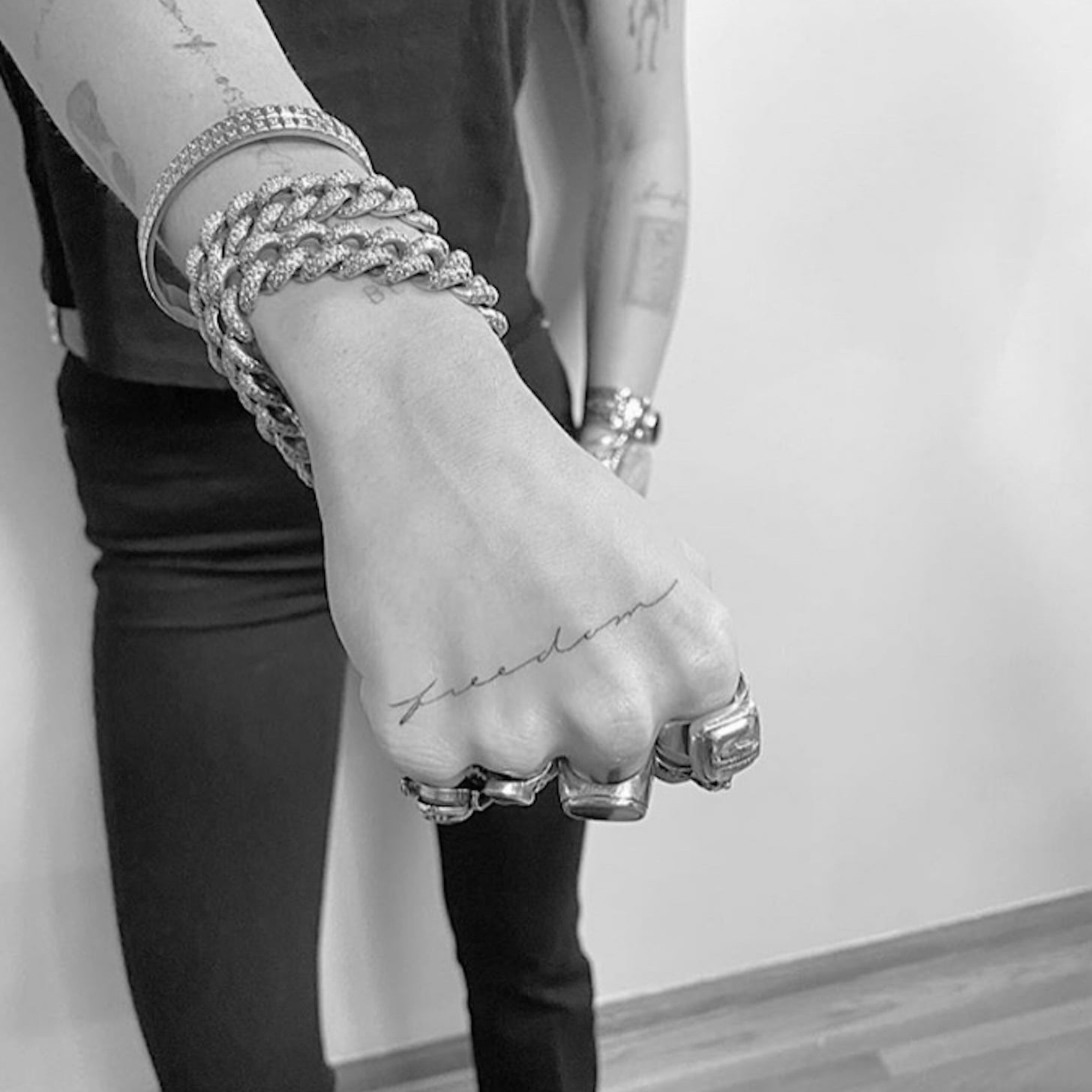 لقد كان عام 2019 مليئًا بالوشوم بالنسبة للمغنية الأمريكية مايلي سايروس خاصًة بعد انفصالها عن زوجها ليام هيمسورث بعد 8 اشهر فقط من الزواج ولكن ابرز الوشوم التي شاركت مايلي جمهورها بصورٍ له هو كلمة "الحرية" المكتوبة على قبضة يدها اليمنى بالكامل.
