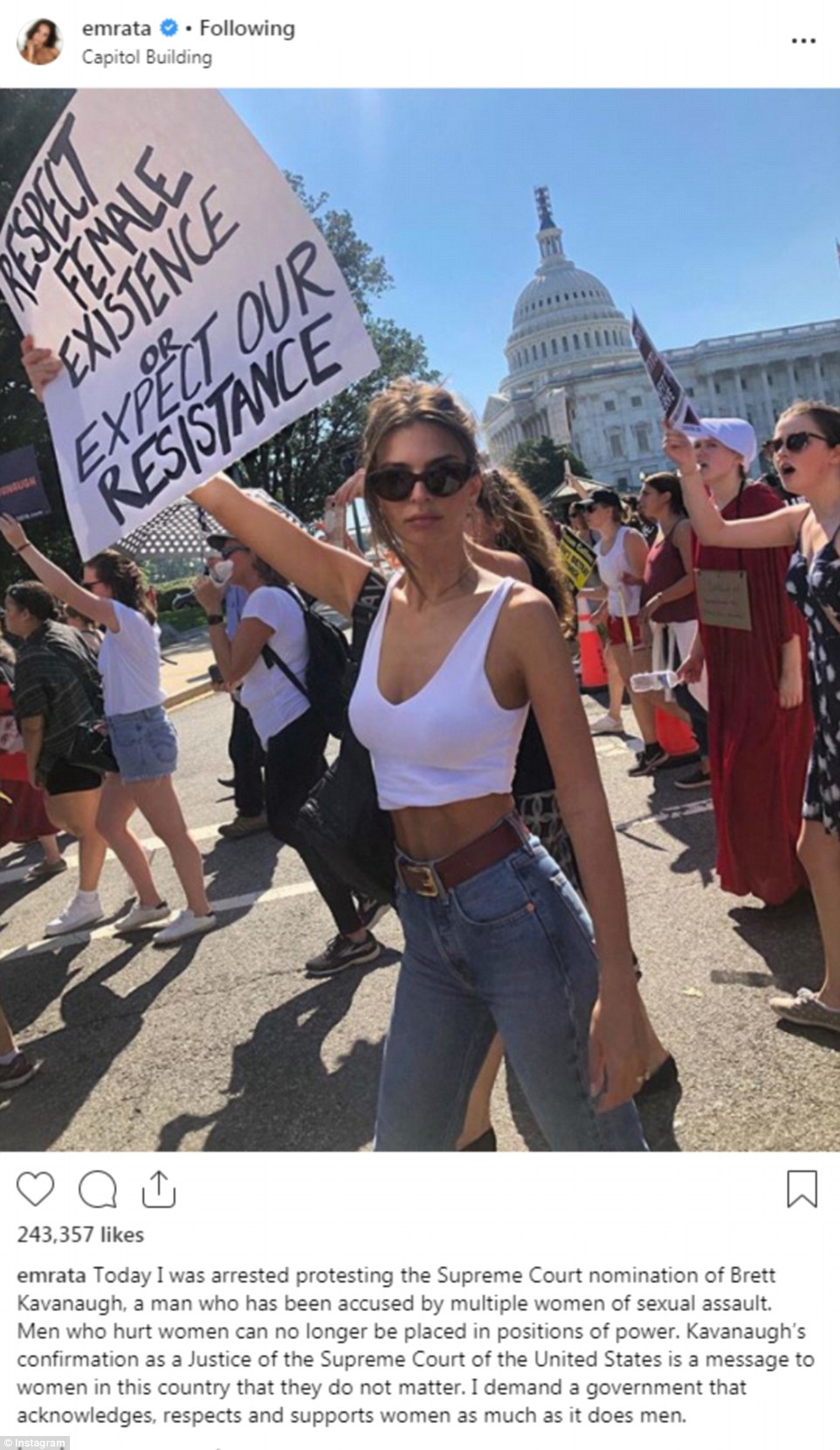 وكتبت "راتاجسكوفكي"، البالغة من العمر 27 عامًا، عبر حسابها على موقع "إنستغرام" بعد إلقاء القبض عليها: "تم إلقاء القبض علي اليوم احتجاجا على ترشيح المحكمة العليا لبريت كافانو، وهو رجل اتهمته عدة نساء بالاعتداء الجنسي.. لا يسمح بوضع الرجال الذين يؤذون النساء في مواقع السلطة".