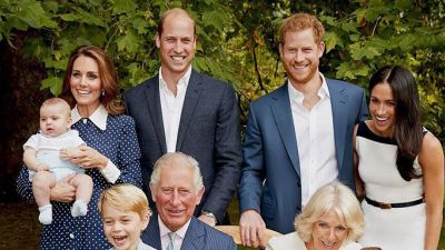 وفي الصورة، تظهر "كاميلا" بفستانها الآيفوري تجلس إلى جانب "تشارلز" الذي وضع حفيده الأمير "جورج" في حضنه، بينما وقفت وراءه "كيت ميدلتون" التي حملت طفلها الأمير "لويس" بين يديها، في حين ابتسمت "ميغان" ابتسامة لطيفة إلى جانب زوجها "هاري" مٌتألقةً بفستان كريمي من توقيع دار الأزياء الفرنسية "جيفينشي".