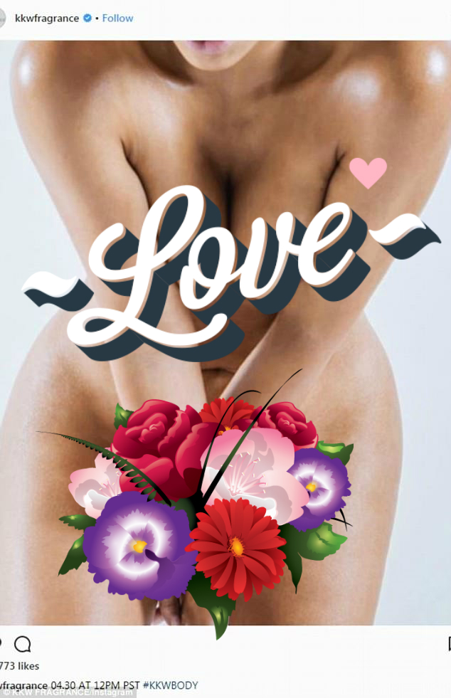 كما شاركت "كيم" صورة أخرى عارية،وعلَّقت: "هذا العطر يحتوي على أكثر الزهور المفضلة لدي وهي الياسمين الممزوجة برائحة خشب الصندل وزهور العنبر! رائحتها حلوة ومسكرة مثل مزيجٍ من الخوخ والورد أيضا!"