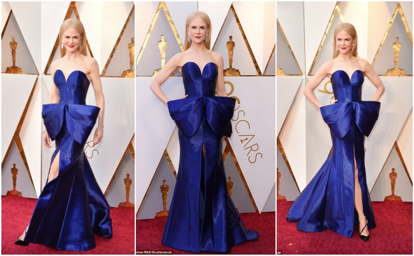 تألقت "نيكول كيدمان" (50 عامًا) أثناء تواجدها على السجادة الحمراء مرتديةً فستان طويل سترابلس نيلي أبرز جمال بشرتها البيضاء، جاءت فتحة صدره على شكل قلب مضيفةً بعض الجمالية لمفاتنها ، كما زيٍّن عند الخصر ببيونة كبيرة بدت أشبه بتنورة منتفخة، وما زاده جمالًا ذيله الطويل ، وفتحته الأمامية التي تصل لفوق الركبة من توقيع "أرماني برايف".