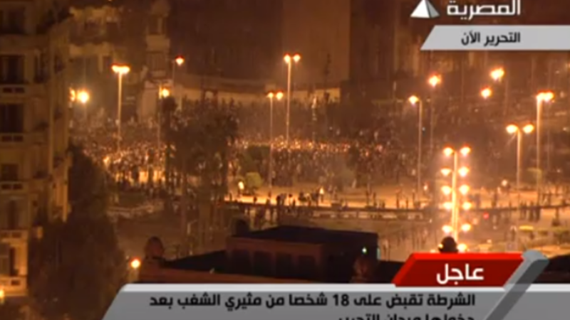 جانب من تغطية التلفزيون المصري الحكومي للأحداث في ميدان التحرير.