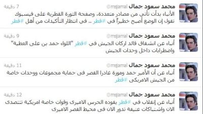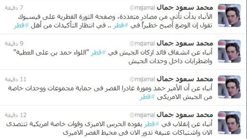 قام محمد سعود جمال وهو مسؤول في موقع العربية نت ويعرف عن نفسه  بأنه "كبير المحررين بالموقع الإلكتروني لقناة العربية" أمس بنشر خبر على صفحته الخاصة في موقع تويتر يتحدث عن انقلاب عسكري فى قطر يقوده الحرس الاميري القطري نحو القصر الاميري، وأن قواتًا خاصة امريكية تتتصدى له، وذكر أن اشتباكات عنيفة تدور الان فى محيط القصر الاميري، وبأن قائد أركان الجيش اللواء حمد بن على العطية قد انشق إضافة إلى حدوث اضطرابات داخل وحدات الجيش.