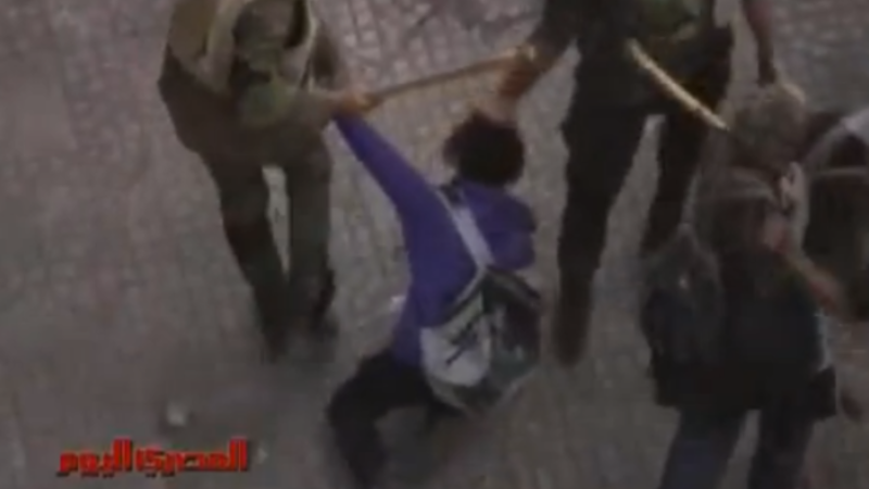مقطع مأخوذ من فيديو نشرته المصري اليوم يظهر الجيش المصري وهو يقوم بسحل فتاة من المتظاهرين.