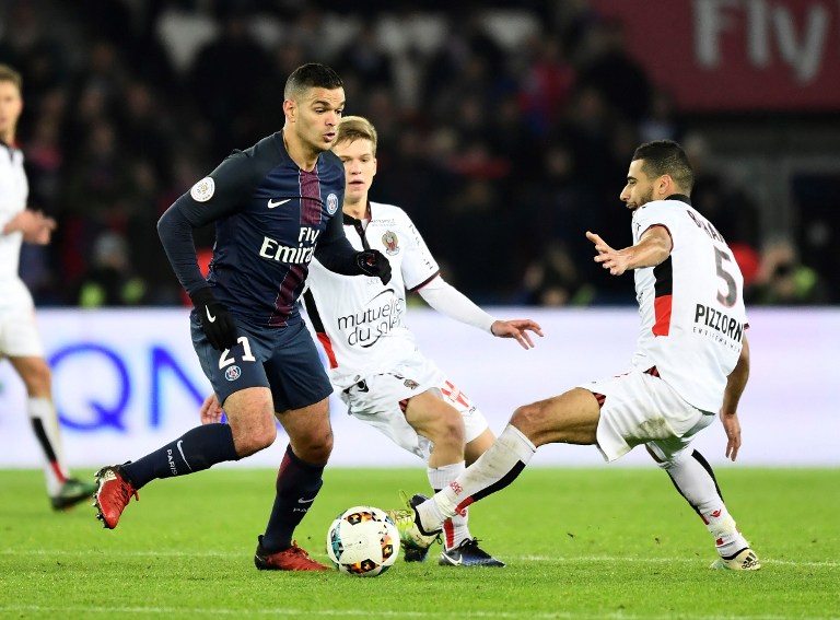 حاتم بن عرفة لاعب باريس سان جيرمان في مواجهة مع يونس بلهندة (يمين) مهاجم نيس خلال مواجهة الفريقين في قمة الدوري الفرنسي والتي انتهت بالتعادل الإيجابي 2-2.
