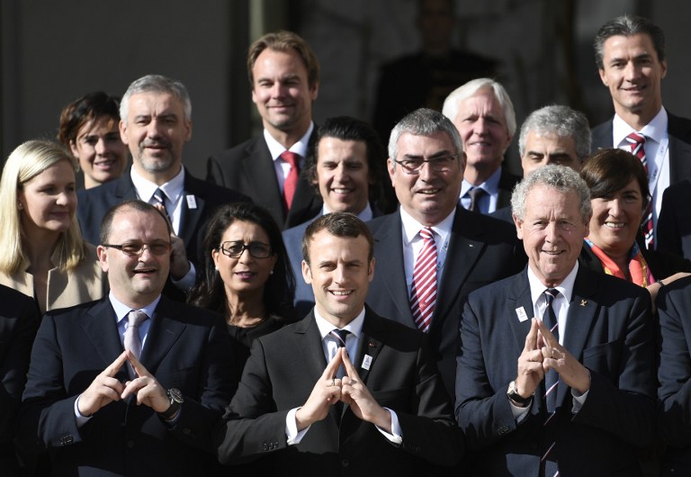 الرئيس الفرنسي إيمانويل ماكرون (وسط) رفقة وفد اللجنة الأولمبية الدولية التي عاينت مرافق باريس في ظل الملف الذي تقدمت به المدينة لاستضافة أولمبياد 2024