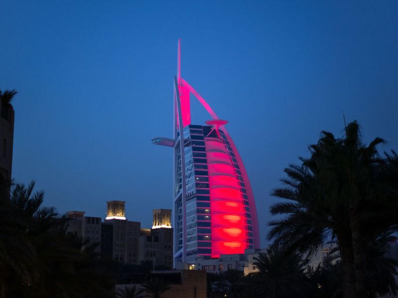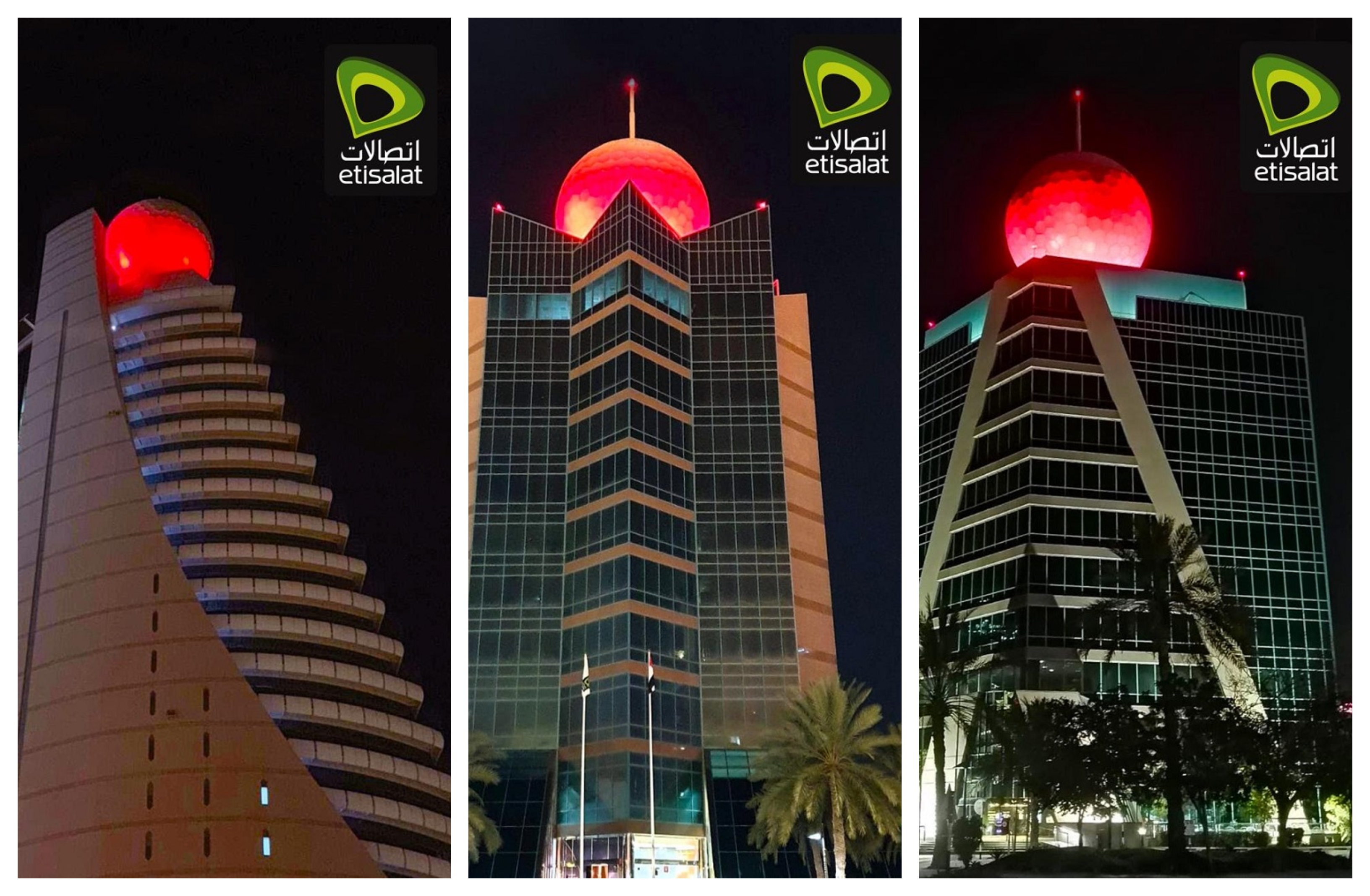 كما تمت إضاءة برج خليفة، أطول مبنى من صنع الإنسان في العالم، وبرج العرب جميرا، الفندق المشهور عالميًا والقرية العالمية باللون الأحمر.