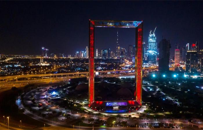 البناء الأيقوني الملهم "برواز دبي" ببريقه الذهبي الذي يعانق الأفق ازدان اللون الأحمر، والمبنى الرئيسي لـ"ديوا" صاحبة الإنجازات العالمية في مجال الاستدامة، ومقر القيادة العامة لشرطة بتصميمه الأخاذ وموقعه الحيوي.
