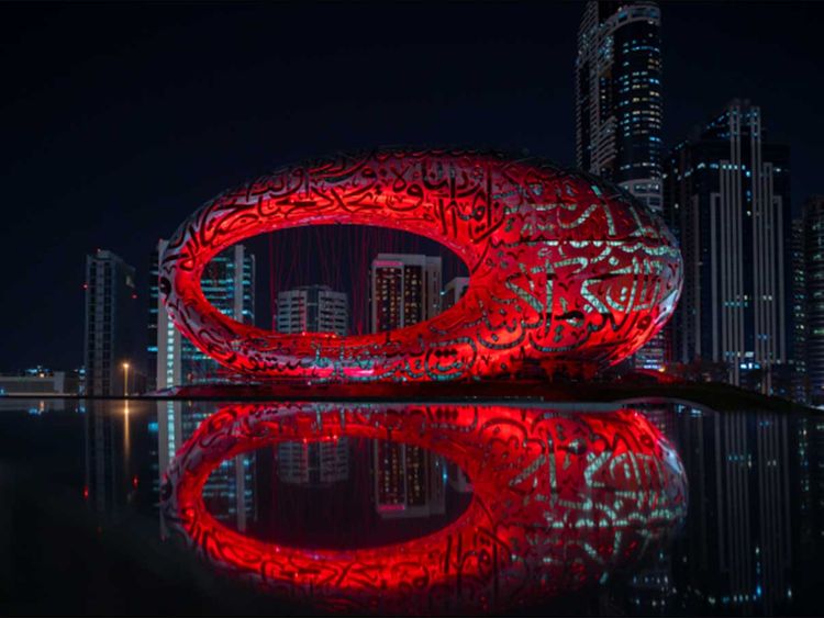 دبي: أضيء مبنى "متحف المستقبل" باللون الأحمر الذي زاد من جمالية هذه الأيقونة الهندسية الرائعة بتصميم المهندس "شون كيلا".
