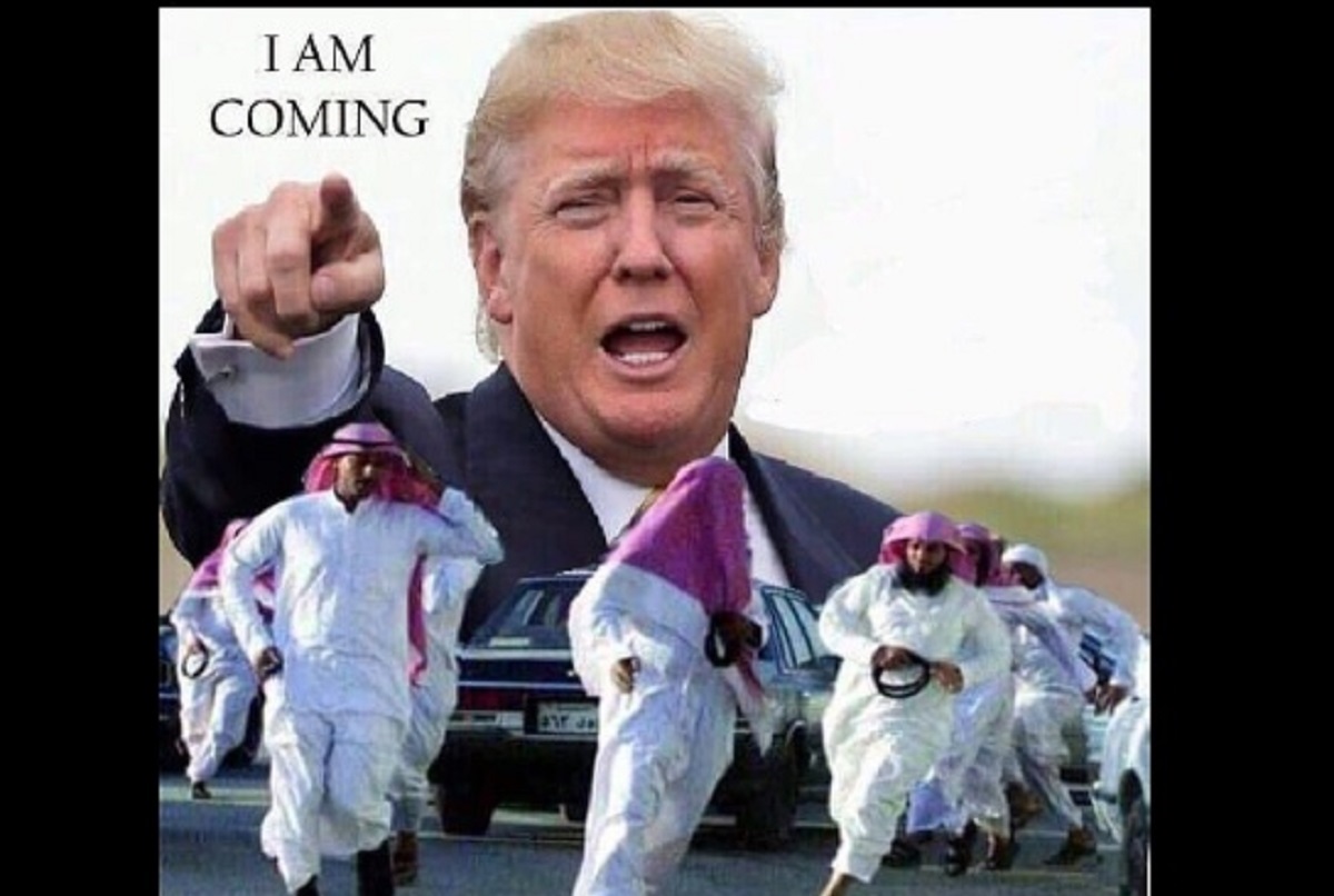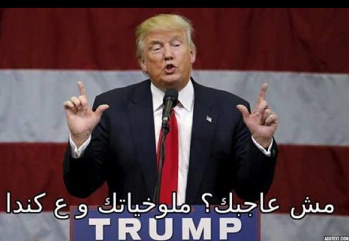 ترامب لم يتوقف عن تهديد العرب بطردهم من أمريكا في جميع تصريحاته أثناء حملته. وبعد فوزه ظهرت صورة ساخر على تويتر يظهر فيها شباب سعوديين يهربوا بعدما اشار لهم ترامب وهو يقول لهم "I am coming".