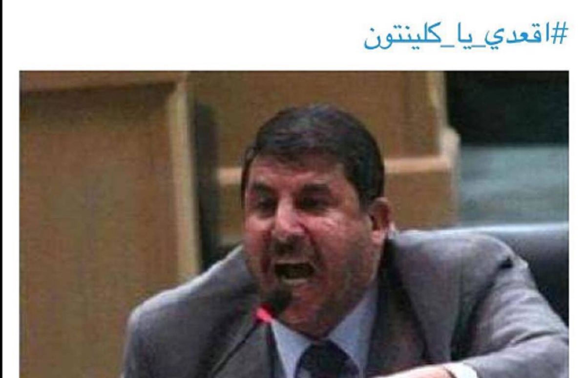 "اقعدي يا كلينتون" صورة ساخرة ظهر فيها النائب الاردني يحيى السعود وهو يطلب من هيلاري كلينتون ان تجلس بعدما خسرت في الانتخابات الامريكية. النائب الاردني اشتهر بهذه الجملة عندما طالب زميلته النائب الاردني هند الفائز ان تجلس بقوله"اقعدي يا هند".