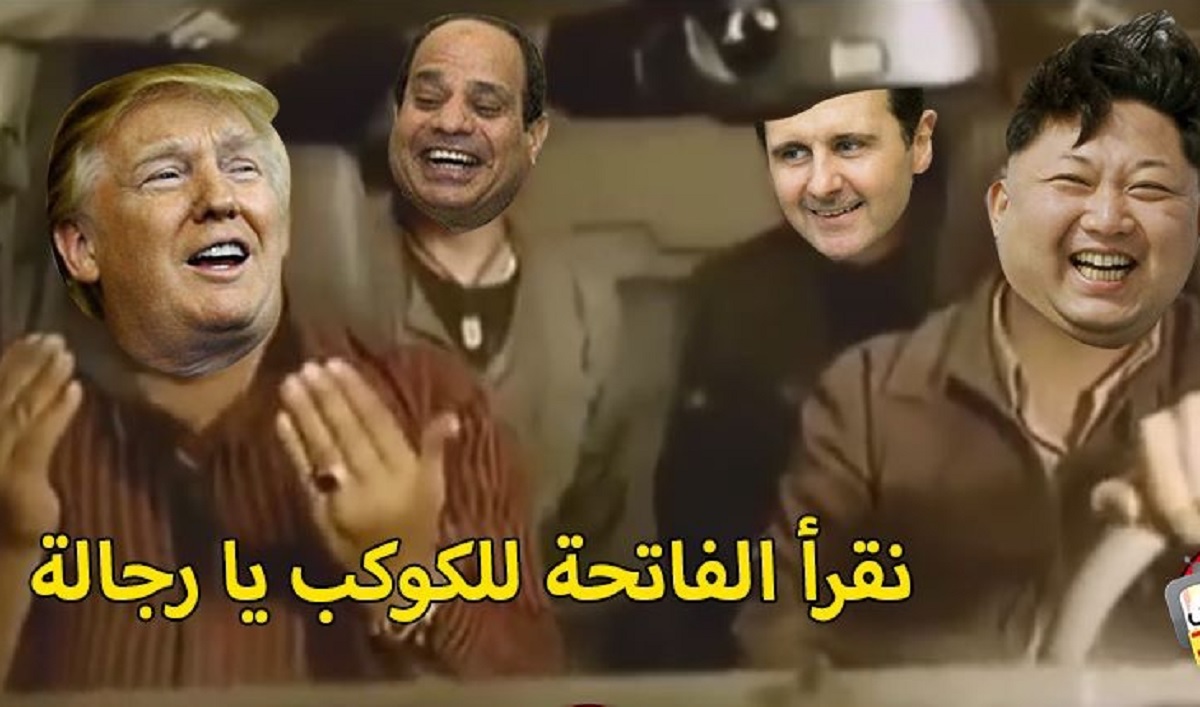 "نقرأ الفاتحة للكوكب يا رجالة"  عنوان الصورة التي جمعت رئيس كوريا الشمالية والرئيس السوري بشار الأسد ورئيس مصر عبدالفتاح السيسي بالإضافة للرئيس ترامب في اشارة الى أن كوكب الأرض في خطر في ظل حكمهم.. لكن برأيكم من تنقص هذه الصورة؟! .. طبعاً "القذافي"