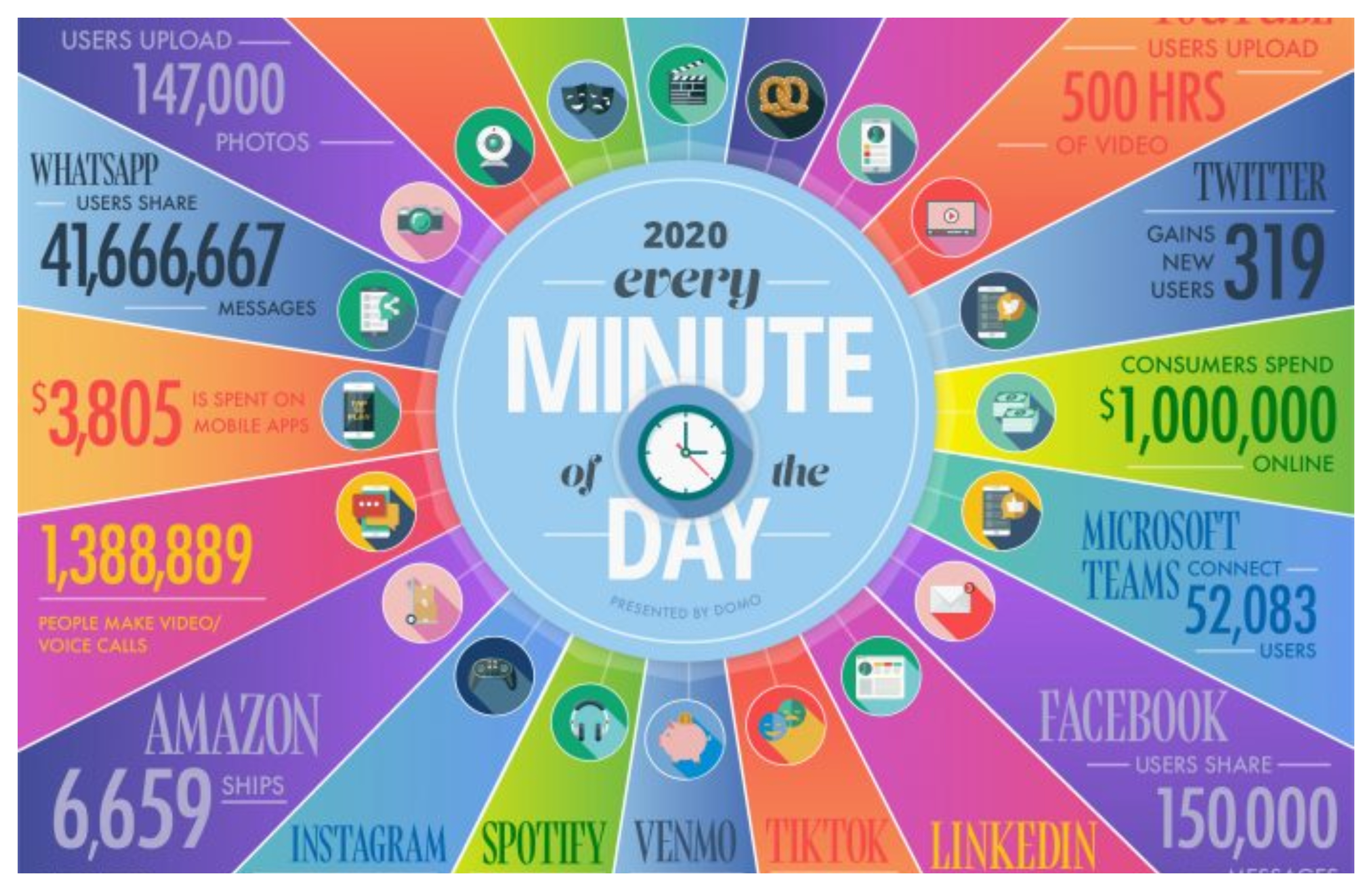 وكشف رسم توضيحي نشر بموقع "Domo" النقاب عن كل ما يحدث على الإنترنت في دقيقة واحدة خلال عام 2020: