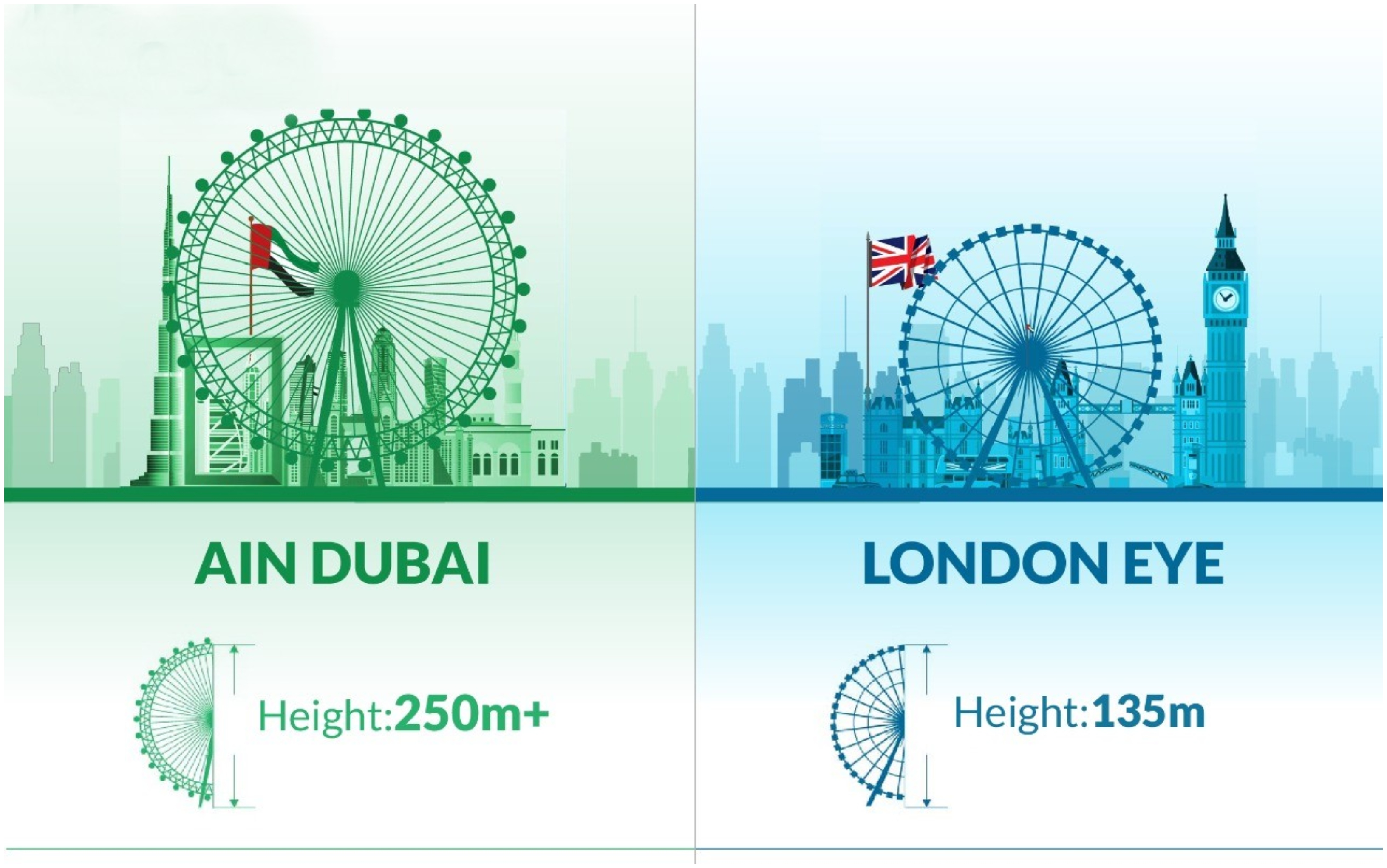 ستأخذ "عين دبي" الركاب إلى ارتفاع 250 مترًا، وهو ما يقارب ضعف ارتفاع "عين لندن" التي يبلغ 135 مترًا فقط.