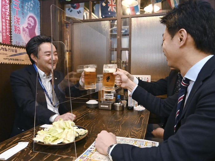 في أحد مطاعم اليابان لا يزال بإمكان الأصدقاء الجلوس معًا، ولكن تم وضع حواجز زجاجية على الطاولات.