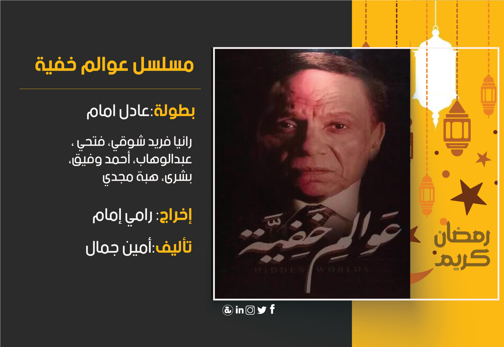 مسلسل عوالم خفية: يجسد عادل إمام فيه دور كاتب صحفي وروائي كبير يرتبط بعائلته ارتباطًا وثيقًا، ولكن حياته تتغير حين تقع في يده مجموعة من المستندات الهامة التي تكشف فساد عدد من المسؤولين