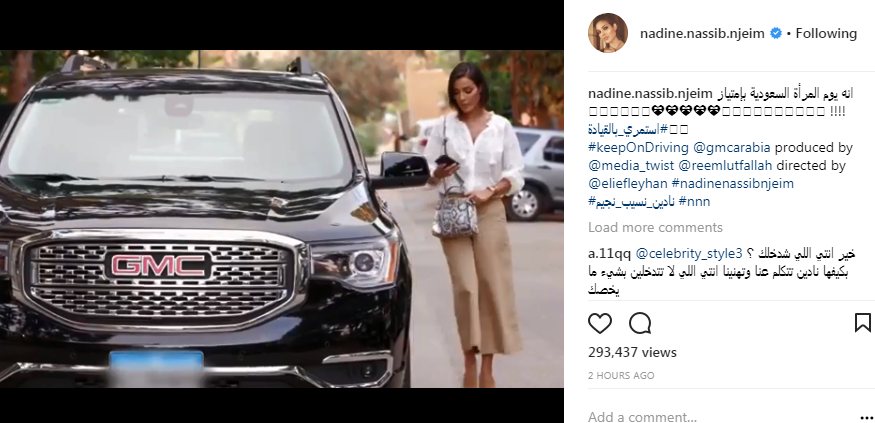النجمة اللبنانية نادين نجيم نشرت فيديو لها عبر إنستغرام هنأت فيه المرأة السعودية بهذ الإنجاز ووصفت الحدث بأنه "يوم المرأة السعودية بامتياز" مشجعة إياها على القيادة والريادة وان تكون نموذجا يحتذى به.