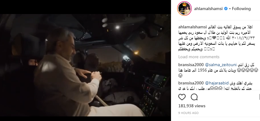 الفنانة أحلام نشرت مقطع فيديو للأمير وليد بن طلال وهو يحتفل بابنته وهي تقود السيارة، عقب رفع حظر القيادة على النساء السعوديات، اليوم الأحد، وذلك عبر صفحتها الشخصية بتطبيق "إنستغرام".