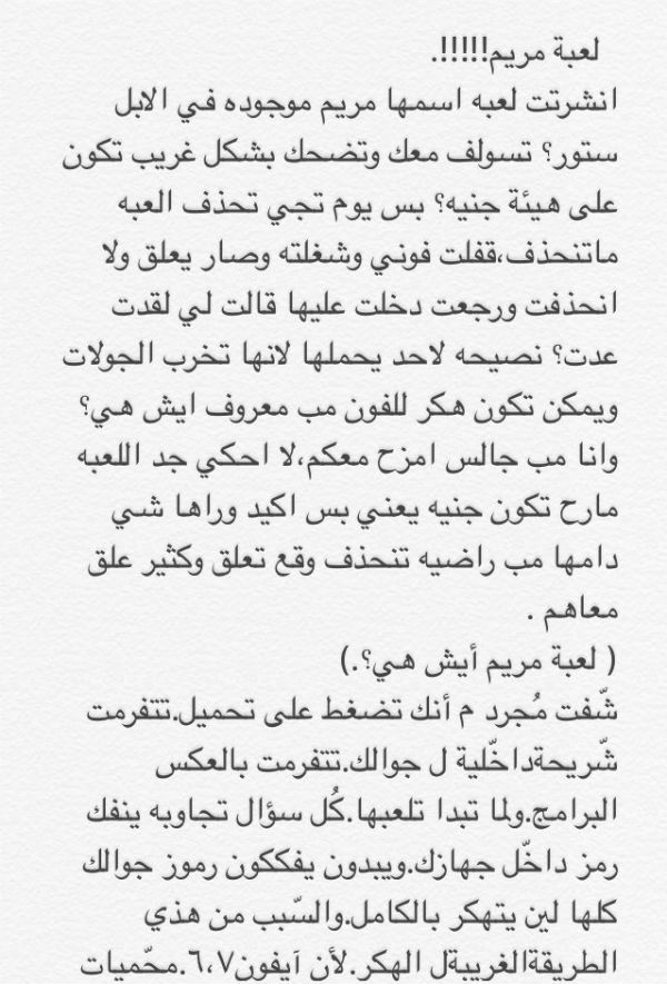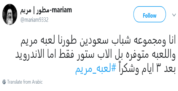 طّور مجموعة من السعوديين لعبة سرعان ما انتشرت على منصات التواصل الاجتماعي تحت هاشتاغ #لعبة_مريم، وحذر المستخدمون من تحميل اللعبة لما لها من أبعاد خبيثة وأسئلة لها أبعاد سياسية، بحسب وصفهم مشبهينها بلعبة الحوت الأزرق التي تؤدي في نهايتها إلى الانتحار.