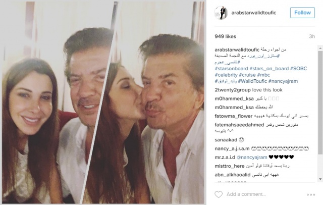 نشر الفنّان وليد توفيق عبر صفحته على تطبيق “انستغرام” صورة جمعته بالفنّانة نانسي عجرم وظهرت نانسي وهي تقبّل وليد على خدّه خلال حفل “ستارز أون بورد” التي انطلقت السبت الماضي وقد أحيا كل من عجرم وتوفيق، فقرته من حفل الرحلة، مشعلين المسرح ومثيرين اعجاب الحضور.