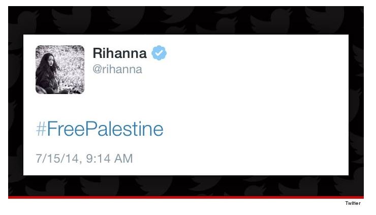 ريهانا: قررت شطب تغريدة بوسم "الحرية لفلسطين" بعد ساعات من كتابتها على موقع التدوين "تويتر" واستبدلتها بتغريدة حول تعايش الأديان.