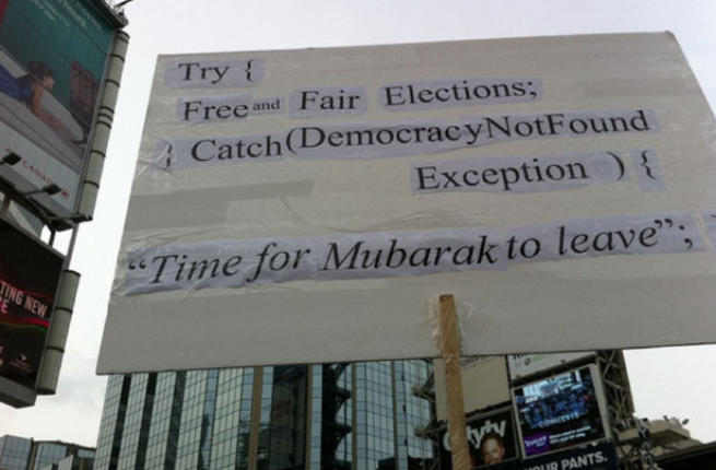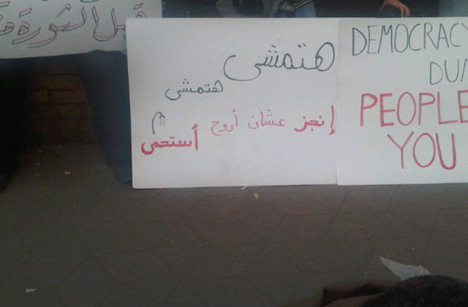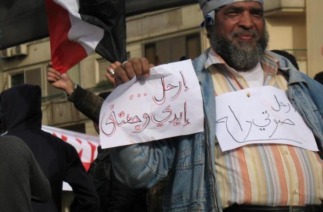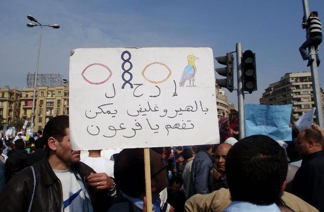 An increasingly frustrated and tired people running out of stamina but maintaining a wicked sense of humor, the Egyptian protesting camp still wait out their Leader's much-called-for departure, injecting a wry humor into their appeals to him to get on with it and leave them to rest. Literally. The following signs are clips of Al Bawaba's favorites.