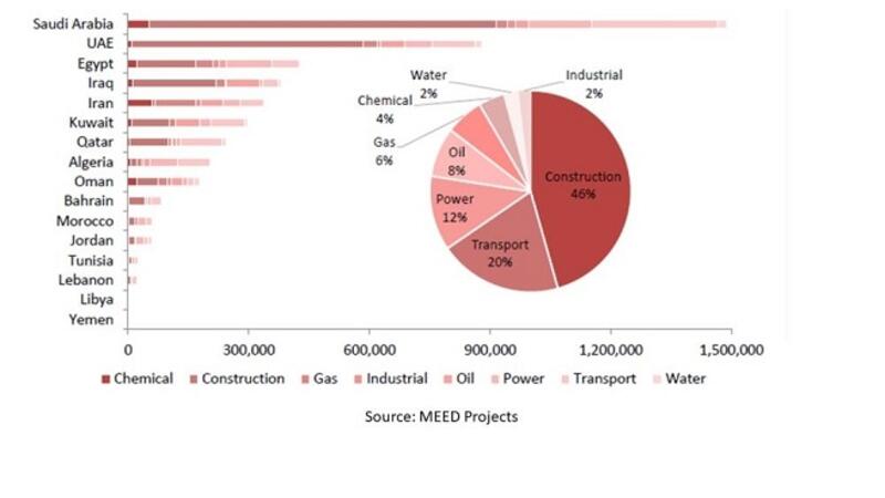 Data from MEED Projects show that construction, which covers private real estate and public buildings, represents the biggest segment of the MENA projects market valued at $2.1 trillion. Transport is the second biggest segment with $931.2 billion of projects; followed by the oil & gas sector, with about $662 billion worth of projects planned or underway.