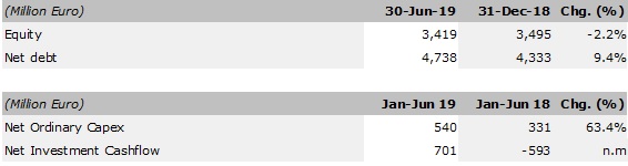 Total net capital expenditure in the period amounted to €701 million (+36.6%). Energy invested €196 million, Infrastructure €350 million and Other Businesses, €161 million.