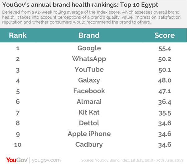 Technology giants WhatsApp and YouTube make an appearance in all three countries. In both UAE and Egypt, WhatsApp has made an improvement. Although in Egypt YouTube has improved its brand health, in the UAE, it has seen a decline in its rank. In Saudi Arabia, both these brands remain in the same spot as last year.