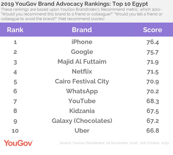 Only in Egypt does iPhone continue to hold the top spot. Google and YouTube have shown improvement and moved up one and two places in the 2019 rankings- to second and seventh, respectively. However, Netflix and WhatsApp have seen a decline this year and moved down two places each, to fourth and sixth, respectively.