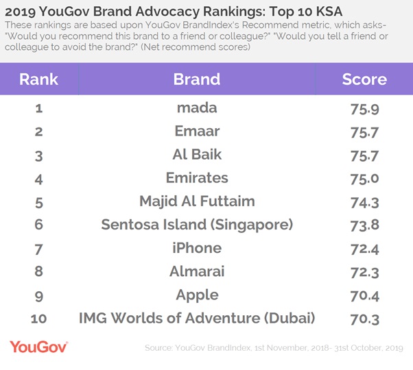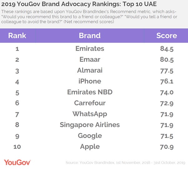 Emirates, Mada and Iphone Top the 2019 YouGov Brand Advocacy Rankings in the Middle East