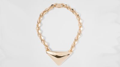 The iconic Prada triangle forms the core of the new jewelry collection, with gold as the focus for the snake bracelets, heart motifs, chain necklaces, and ribbon chokers, with the triangle appearing either as a clasp closure, earrings or pendants, all exaggerated in size.