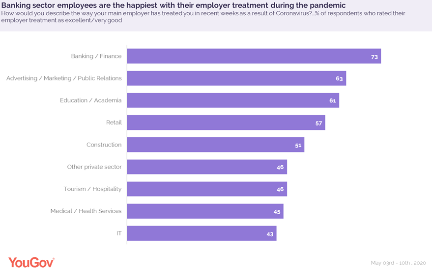 The figures are noticeably higher among employees working in the ‘Banking & Finance’ sector (73%). Advertising/ Marketing/ PR professionals (63%) and those working in the ‘Education’ sector (61%) also seem happy with their employer’s conduct towards them during this time, YouGov’s latest research reveals.