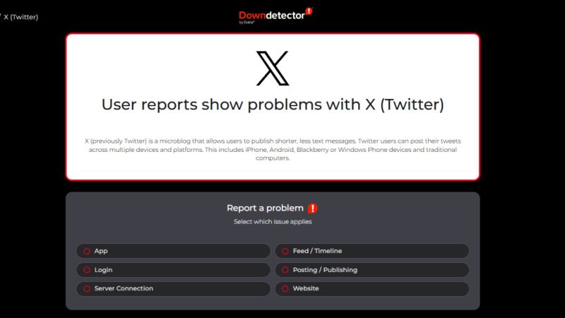 Downdetector wrote, "User reports show problems with X (Twitter)."