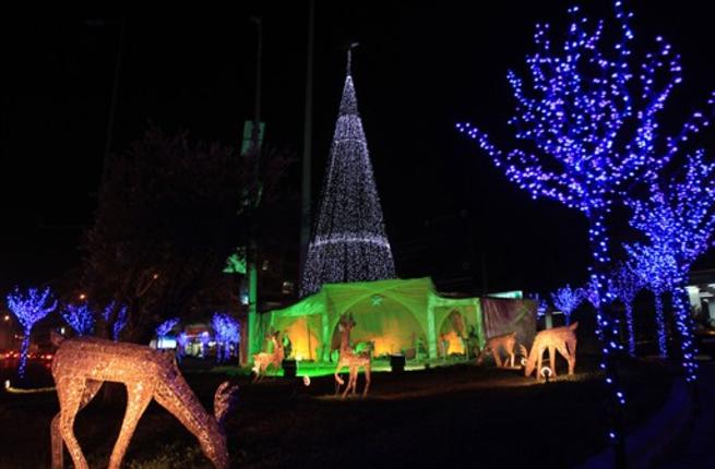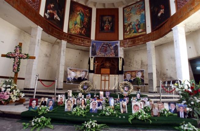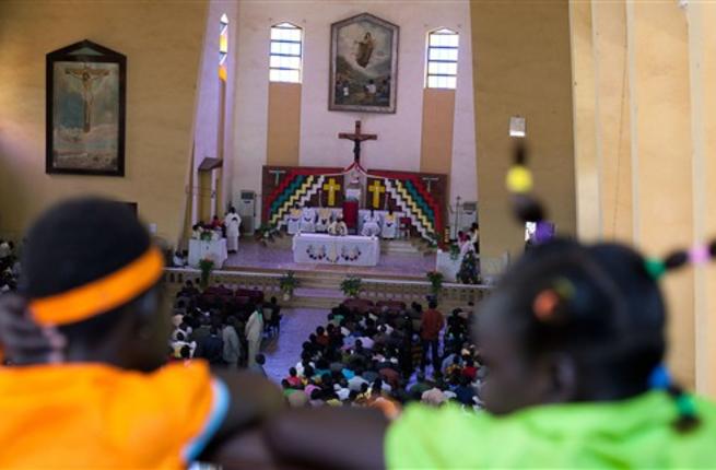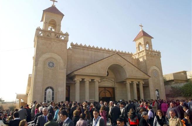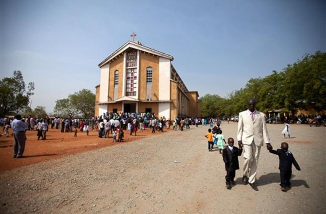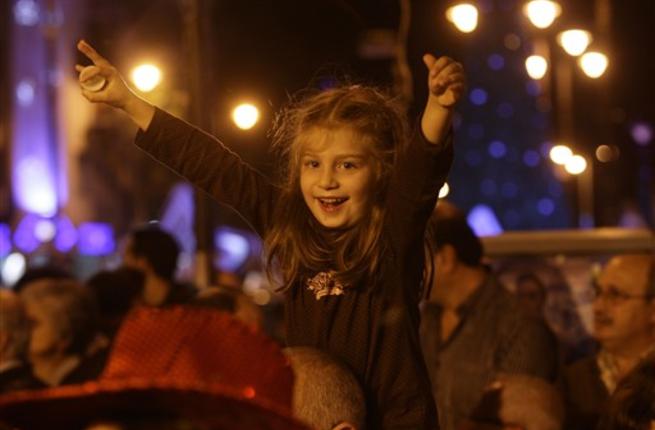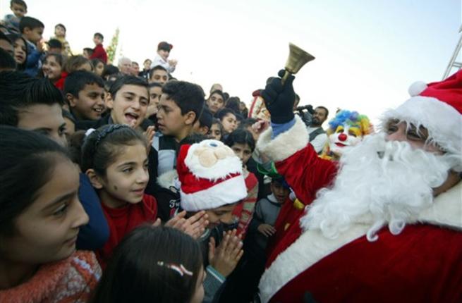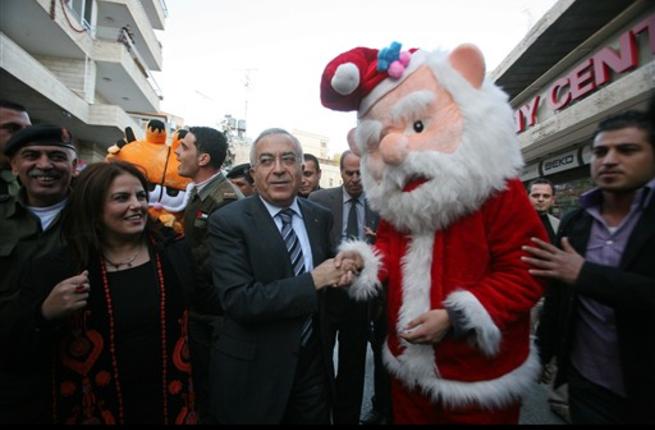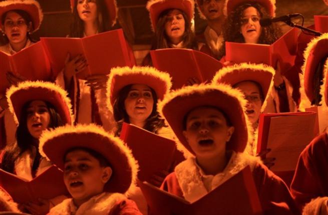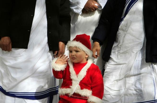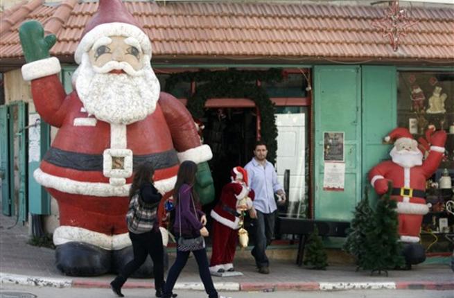 A Palestinian policeman stands guard as Nigerian worshippers cross a street near the Church of the Nativity in the Biblical West Bank city of Bethlehem, believed to be the birthplace of Jesus Christ, in the West Bank town of Bethlehem, as the Holy Land prepares to mark Christmas.