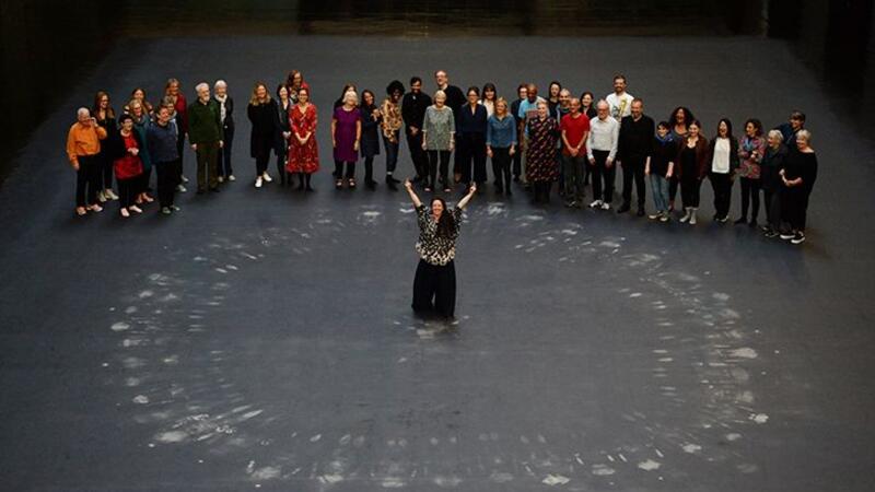 Tania Bruguera, centre, and guests stand after lying on her artwork, a heat-sensitive floor, in the Turbine Hall at the Tate Modern (Twitter)