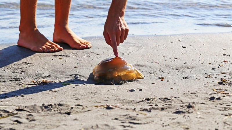 Bluebottle jellyfish colonies appear like blue-tinged sacs which measure up to 15 cm long. People can be stung in the water or on sand.
