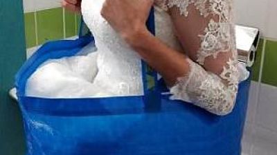 The woman, from North Yorkshire, came up with a genius way of using the loo without getting her dress dirty by cutting a hole in the bottom of a 50p Ikea carrier bag and gathering the folds of her dress into it.