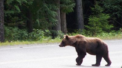 The bear climbs into the back seat of the car and soon reappears carrying a bag of food.
