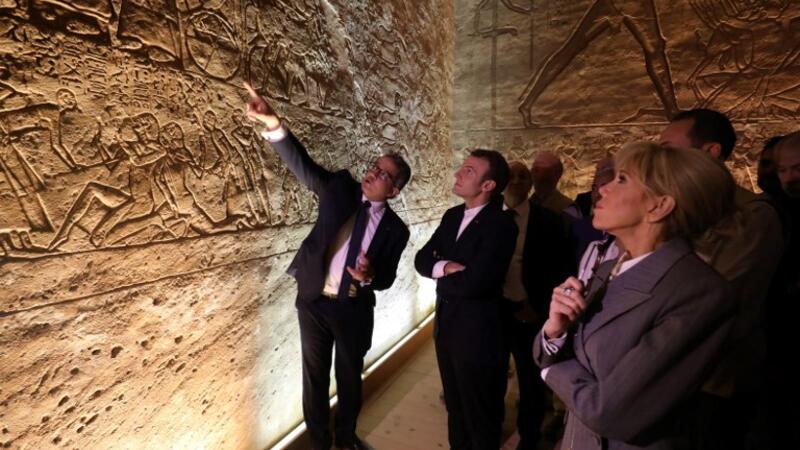 The Macrons’ visit to Egypt began with a tour inside the Ramses II temple in Abu Simbel. There they listened to an explanation of the history of the temple and its engravings about the wars of King Ramses II and the history of Egypt during that period.