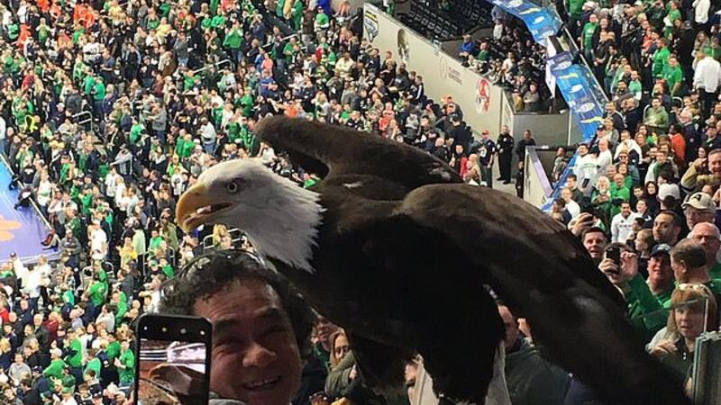 A professional eventually came to claim the eagle from the third level of the stands in the corner of the stadium.