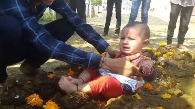 This is the shocking moment crying children are placed in cow dung for the Hindu festival of Govardhan Puja.