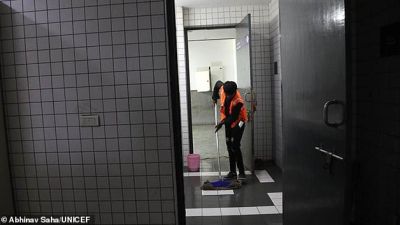 The sobering photograph shows the schoolboy wearing a hi-vis orange vest over his clothes as he mopped the floors of the Thyagaraj Stadium in New Delhi, India.