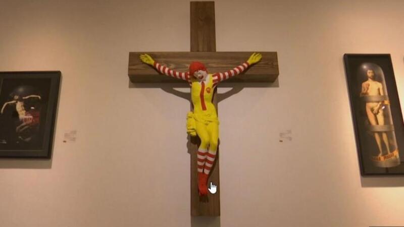 An art exhibit depicting a fast-food clown nailed to a cross is to be taken off. (Twitter)