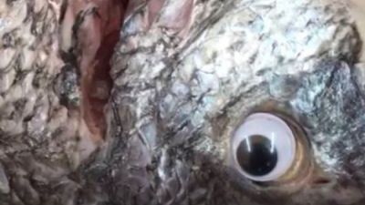 One of the pictures posted online showed the fake eye slipping off the fish's face, clearly revealing a much more yellow eye underneath.