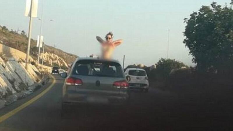 The woman flashed her chest to motorists while standing up in a car that was travelling along the country's only motorway in Saida.