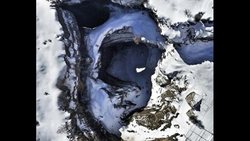 “You have to snowshoe to get there,” he added, referring to the photo of a gaping blue-and-green hole surrounded by snow. “One good thing with drones is that you don’t have to get very close and can send the drone to places you can’t reach it has a range of about 2 kilometers but I like to get at least 500 meters close to not lose sight of the drone.”