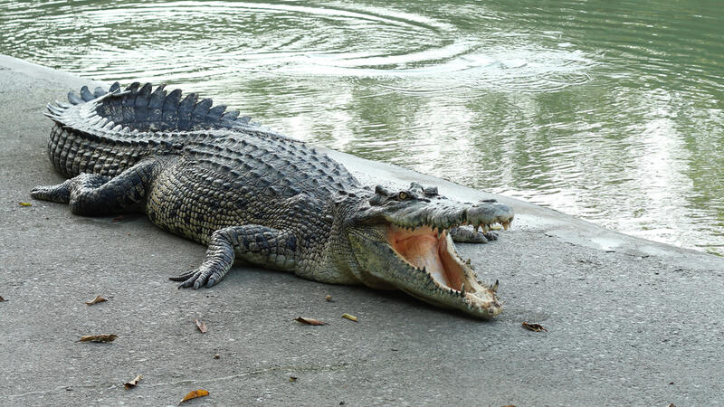 The boat's owners shout at the crocodile as it starts to break off the boat's awning.