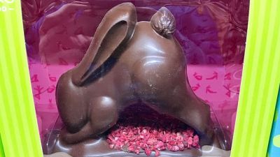 With its backside stuck up high into the air flaunting its milk chocolate tail, the 'yoga bunny' has hit the shelves in the run-up to April 21.